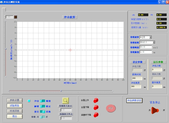 設(shè)備工作時(shí),是由提升機(jī)構(gòu)將工作臺(tái)面沿導(dǎo)向軸提升到一定高度后,臺(tái)面就具有一定的重力勢(shì)能,同時(shí)該設(shè)備還配有四根高強(qiáng)度的彈力繩,當(dāng)臺(tái)面提升時(shí),彈力繩也被拉伸具有彈性能。當(dāng)臺(tái)面到達(dá)指定的位置后,抱閘鎖緊機(jī)構(gòu)工作,將臺(tái)面牢牢的鎖死在導(dǎo)向軸上,提升機(jī)構(gòu)下落,當(dāng)提升機(jī)構(gòu)到達(dá)初始的最低位置后,檢測開關(guān)發(fā)出指令,控制器得到指令后就讓計(jì)算機(jī)控制界面的跌落按鈕變亮,在點(diǎn)擊跌落命令后,鎖緊機(jī)構(gòu)打開,靜止的臺(tái)面在重力勢(shì)能和彈力繩彈性能的作用下加速向下運(yùn)動(dòng),當(dāng)運(yùn)動(dòng)的臺(tái)面撞擊到臺(tái)體砧座上安放的波形發(fā)生器后,就會(huì)產(chǎn)生一個(gè)沖擊脈沖,測量系統(tǒng)撲捉并顯示這一沖擊脈沖的波形、脈沖峰值加速度、脈沖的持續(xù)時(shí)間等參數(shù),我們就從顯示的數(shù)據(jù)上知道了這次臺(tái)面沖擊時(shí)獲得的脈沖峰值加速度、脈沖持續(xù)時(shí)間、脈沖波形的失真情況。臺(tái)面在沖擊后會(huì)沿導(dǎo)向軸向上反彈,為防止工作臺(tái)面二次和波形發(fā)生器撞擊,產(chǎn)生二次碰撞沖擊脈沖,鎖緊機(jī)構(gòu)會(huì)在工作臺(tái)面反彈后鎖緊臺(tái)面在某一高度。臺(tái)面和波形發(fā)生器撞擊瞬間產(chǎn)生的沖擊能量將由臺(tái)體底部安裝的空氣彈簧以及阻尼器來運(yùn)動(dòng)吸收,有效降低沖擊能量對(duì)周圍環(huán)境的影響。調(diào)整波形發(fā)生器的硬度、厚度就可改變沖擊脈沖波形的持續(xù)時(shí)間,改變工作臺(tái)面的提升高度,就可改變沖擊脈沖峰值加速度的大小。