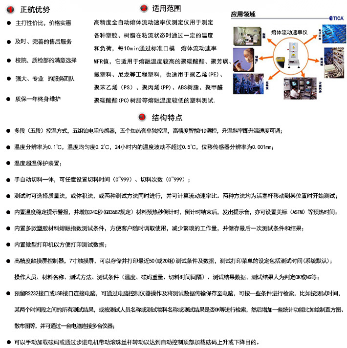 | 產(chǎn)品用途: 用于測(cè)定各種塑膠、樹(shù)脂在粘流狀態(tài)時(shí)通過(guò)一定的溫度和負(fù)荷,每10min通過(guò)標(biāo)準(zhǔn)口模熔體流動(dòng)速率MFR值,它適用于熔融溫度較高的聚碳酸酯、聚芳砜、氟塑料、尼龍等工程塑料,也適用于聚乙烯(PE)、聚苯乙烯(PS)、聚丙烯(PP)、ABS樹(shù)脂、聚甲醛(POM)、聚碳酸酯(PC)樹(shù)脂等熔融溫度較低的塑料測(cè)試,廣泛地應(yīng)用于塑料生產(chǎn),塑料制品、石油化工等行業(yè)以及相關(guān)院校、科研單位和商檢部門。 | |